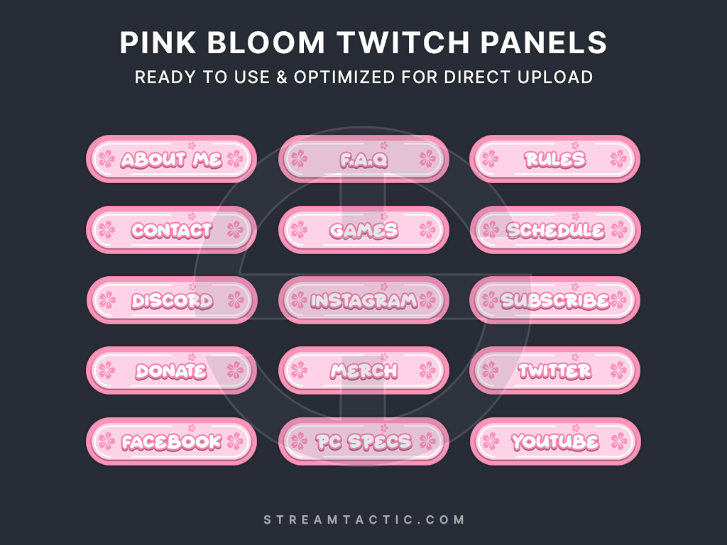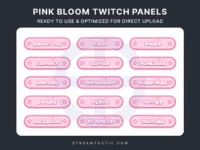 Add elegance and charm to your channel with our Pink Bloom Twitch Panels. Featuring delicate pastel pink hues and three graceful blossom flowers, these stadium-shaped panels are the perfect touch of sophistication for your stream