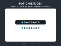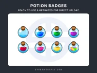 Upgrade your Twitch channel with the Potion Bit/Sub Badges, featuring a circular potion bottle design complete with colorful liquid and a magical sparkle effect.