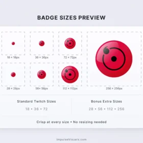 Upgrade your stream with this Sharingan-style anime eye sub badge pack designed for Twitch subscribers. These bold, high-contrast badges stay sharp and readable even at small sizes, making them perfect for chat visibility and subscriber progression.